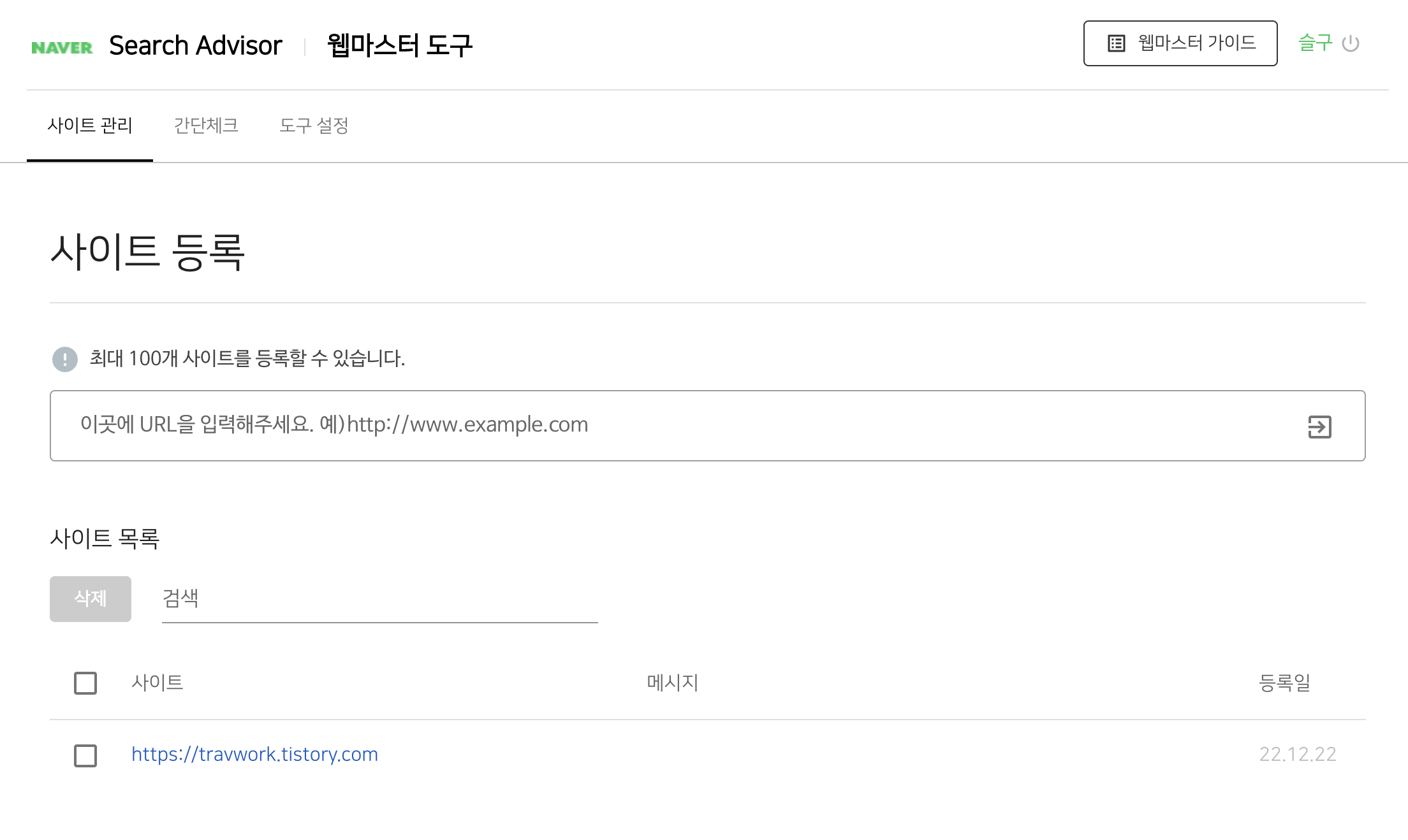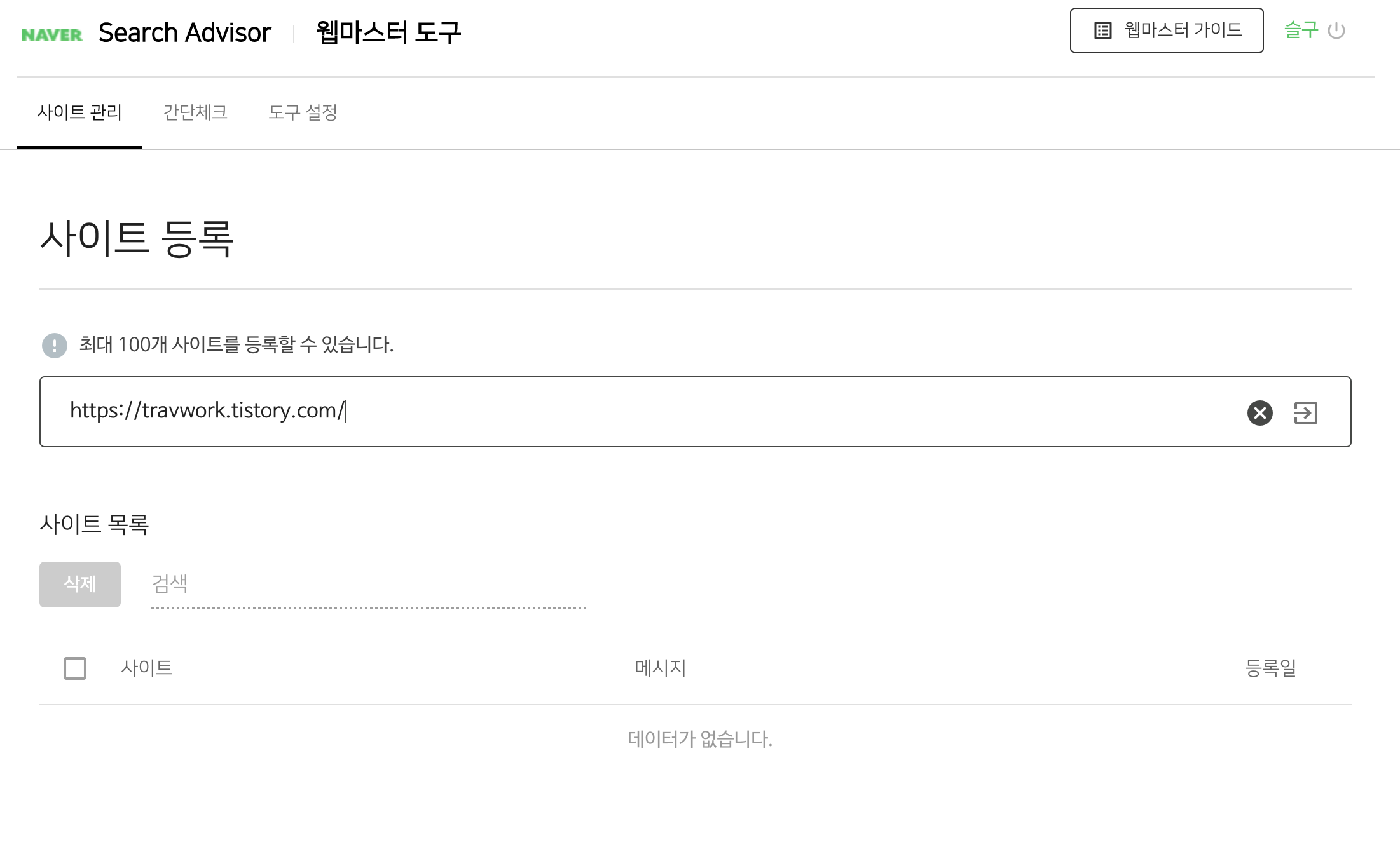 2. 우측 상단 [웹마스터 도구] 접속하여 내 티스토리 URL 등록