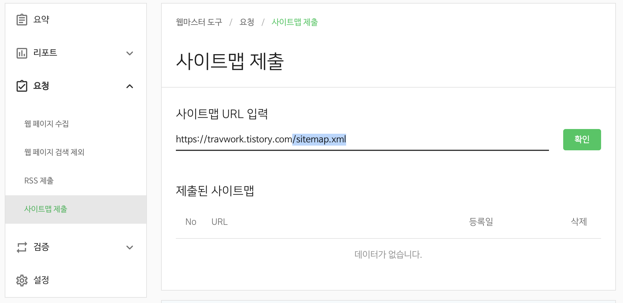 2. 요청 > 사이트맵 제출 접속 후, 내 티스토리 URL 뒤에 /sitemap.xml 추가하여 [확인] 버튼 클릭