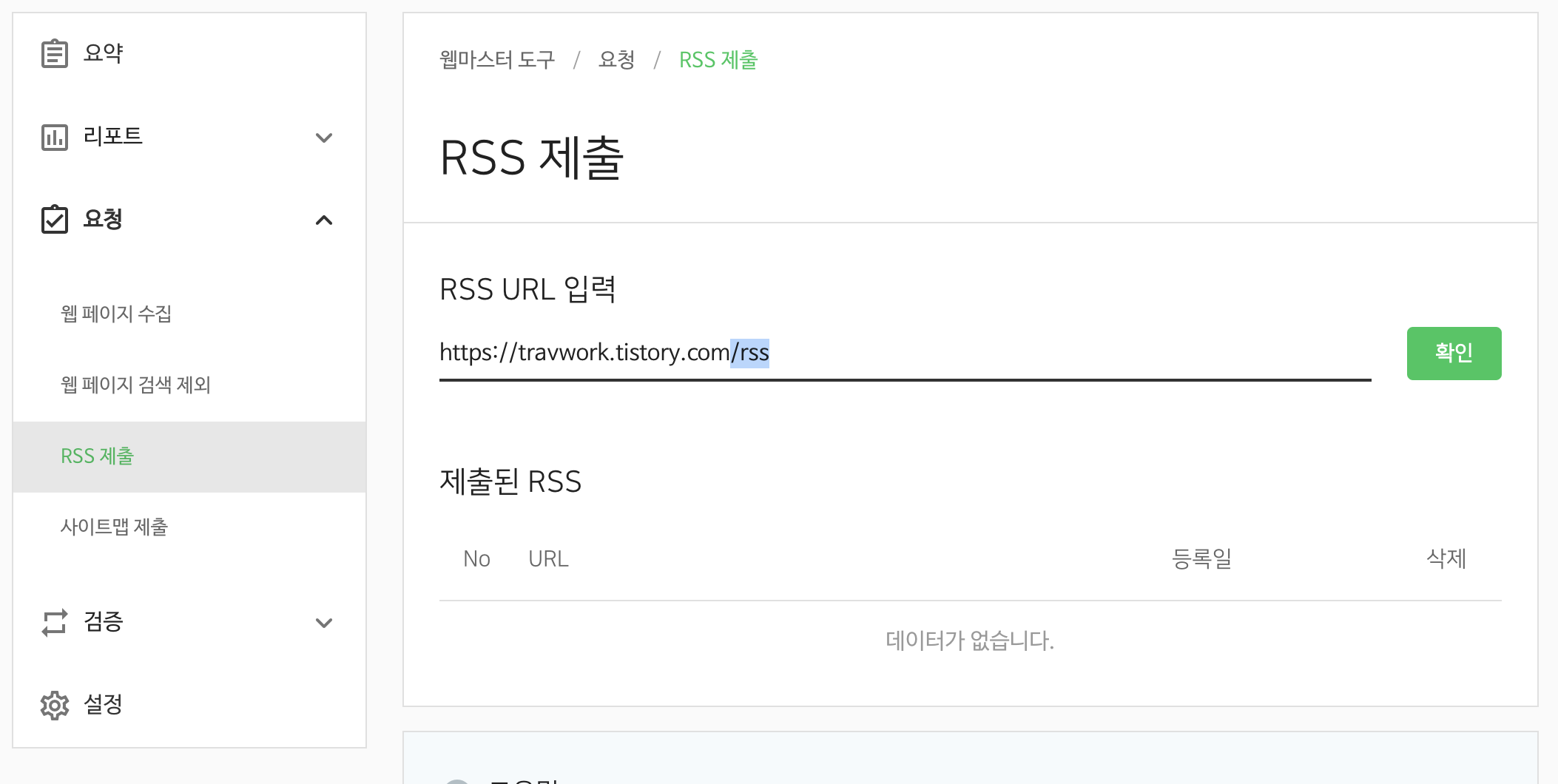 1. 요청 > RSS 제출 접속 후, 내 티스토리 URL 뒤에 /rss 를 추가하여 [확인] 버튼 클릭