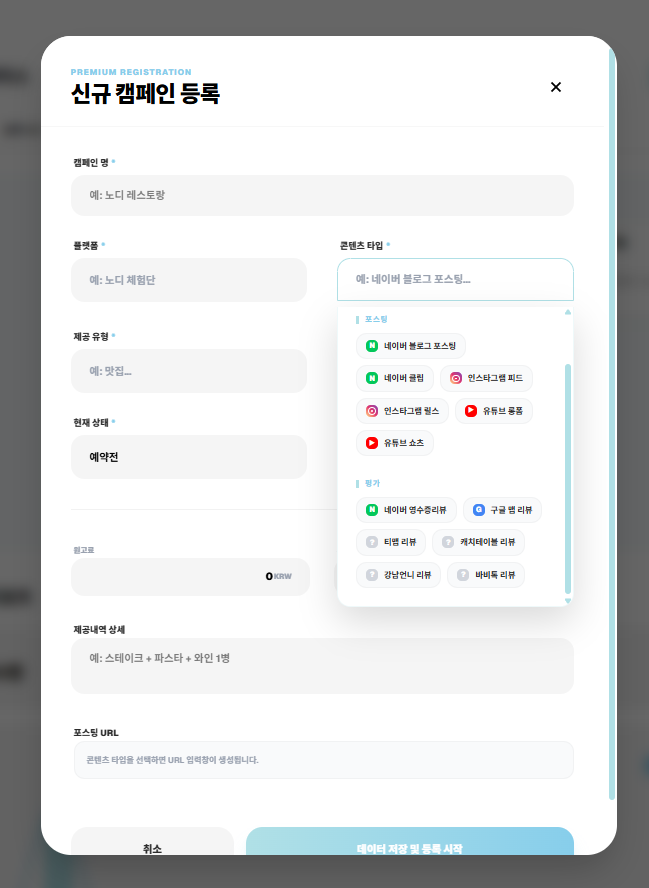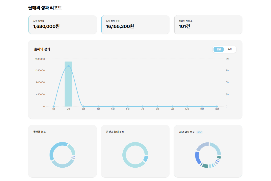 대시보드 고도화까지가 오늘의 목표였는데 신규 캠페인 등록 기능에만 3시간 넘게 걸렸다. 몇 가지 컨셉을 주고 Antigravity가 구현한 대시보드인데 꽤 그럴싸하다. 시각화 화면은 좀 더 디벨롭 해봐야지.
